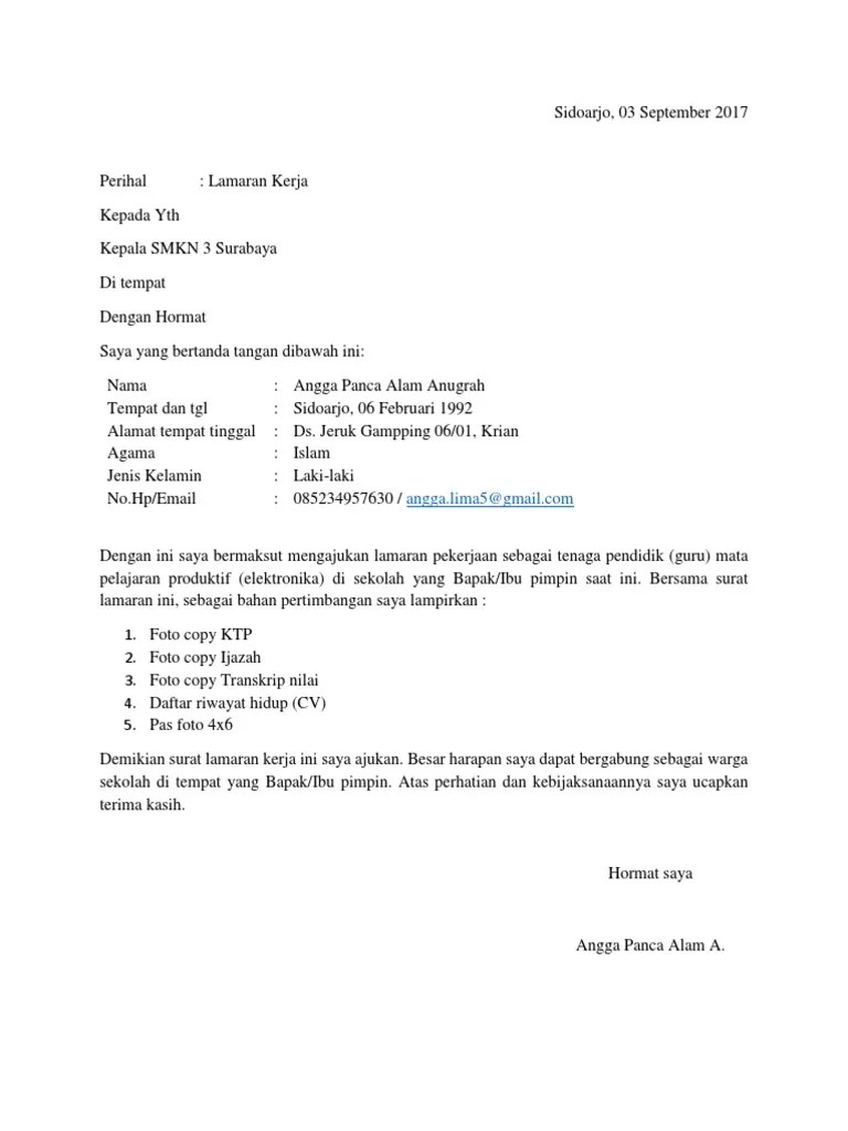 contoh surat lamaran kerja via email.nama saya agung ariftianto, pria usia 26 tahun, telah menyelesaikan pendidikan jurusan bahasa dan sastra inggros di universitas negeri semarang pada tanggal 11 september 2016 dengan ipk 3.61. Minggu, 22 agustus 2021 tambah komentar. 10 contoh surat lamaran kerja guru sd, smp, sma , bimbel yang baik dan benar berbagai kepeluan contoh surat tugas dinas resmi " contoh surat lamaran kerja dalam bahasa inggris. contoh surat lamaran kerja guru sejarah guru surat pendidikan.