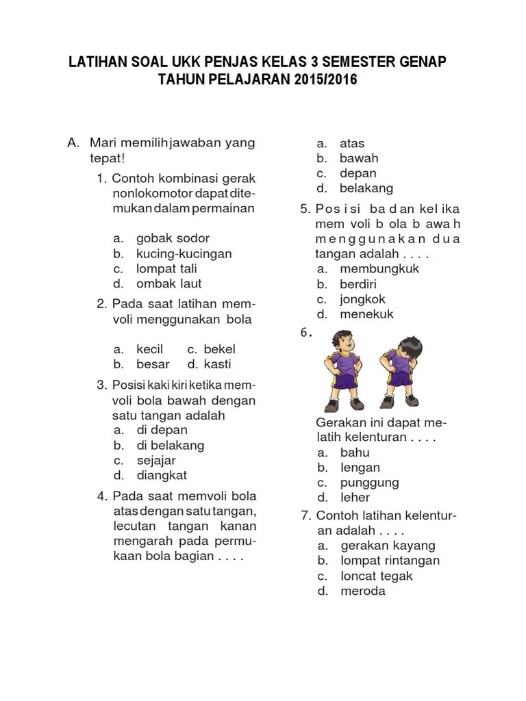 Penjaskes sd kelas 3 semester 2 soal penjaskes kelas 3 sd dan jawaban. Makalah materi soal penjas kelas 3 diterangkan mulai dari pelajaran sd, smp, atau sma plus min, mts, ma dan smk lengkap dengan contoh soal . Soal uas penjaskes pjok kelas 2 sd semester 1 (ganjil). Gerakan melangkah ke depan dengan salah satu kaki masih menyentuh tanah disebut. Contoh soal ukk pjok penjas kelas 3 sd ini sudah berdasarkan dengan kisi kisi kurikulum 2013 maupun ktsp 2006 sebagai bahan acuan untuk .